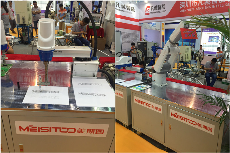 美斯圖自動(dòng)化作為日本東芝機(jī)械手的一級(jí)代理商,攜四軸水平關(guān)節(jié)機(jī)器人,六軸多關(guān)節(jié)機(jī)器人出席此裝備制造展會(huì),同時(shí)并展出兩臺(tái)機(jī)械手進(jìn)行三工位操作的應(yīng)用案例:PCBA 剪腳設(shè)備,同時(shí)運(yùn)動(dòng)控制事業(yè)部也靜態(tài)展示了多軸運(yùn)動(dòng)控制卡,控制器等硬件平臺(tái),并為需求定制的客戶配套軟硬件的解決方案。